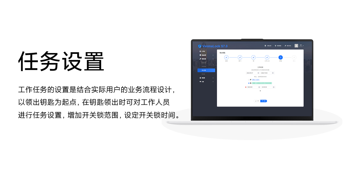 工作任務(wù)的設(shè)置是結(jié)合實(shí)際用戶的業(yè)務(wù)流程設(shè)計(jì),以領(lǐng)出鑰匙為起點(diǎn),在鑰匙領(lǐng)出時可對工作人員進(jìn)行任務(wù)設(shè)置,增加開關(guān)鎖范圍,設(shè)定開關(guān)鎖時間。