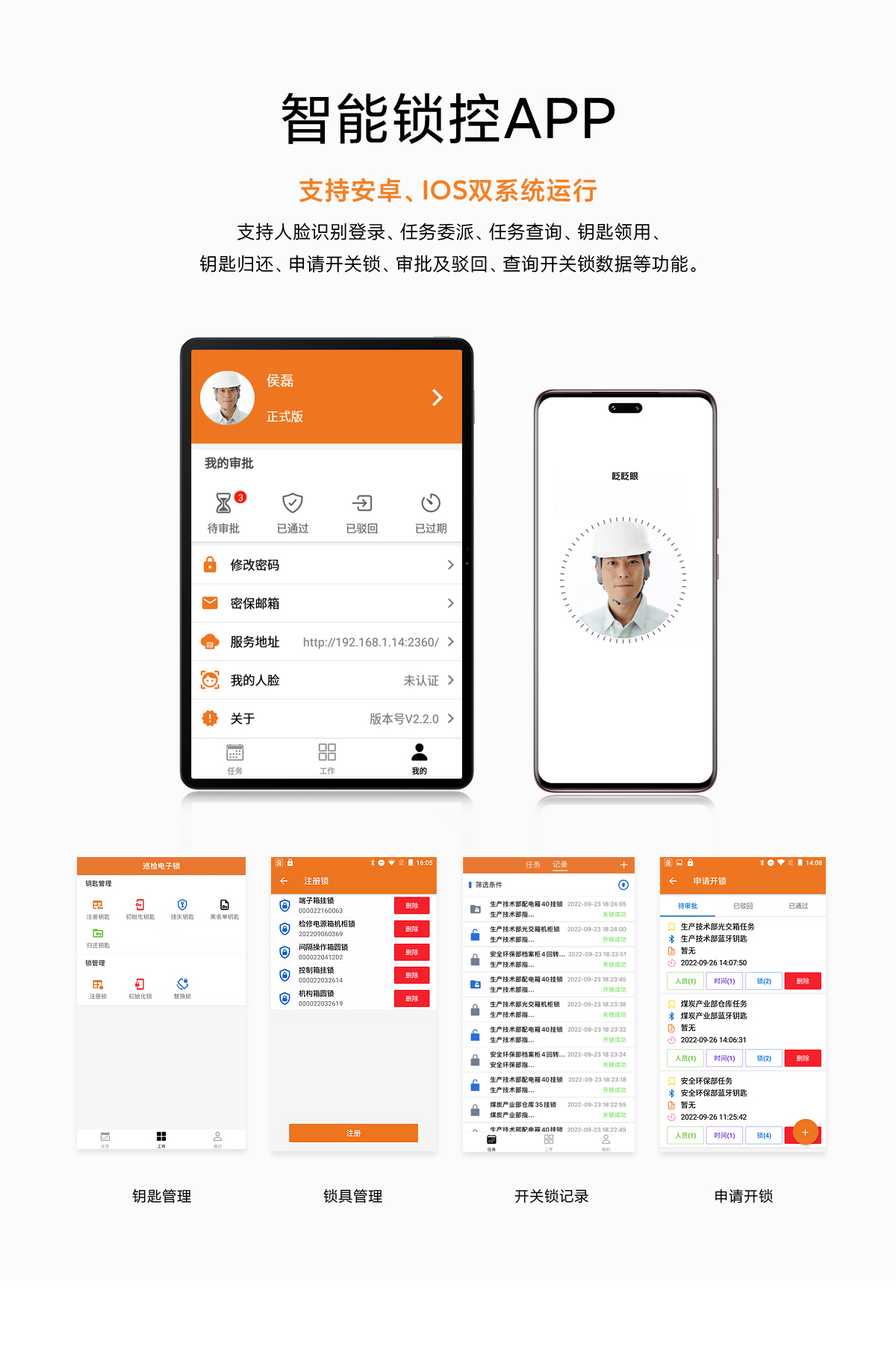 支持人臉識別登錄、任務(wù)委派、任務(wù)查詢、鑰匙領(lǐng)用、鑰匙歸還、