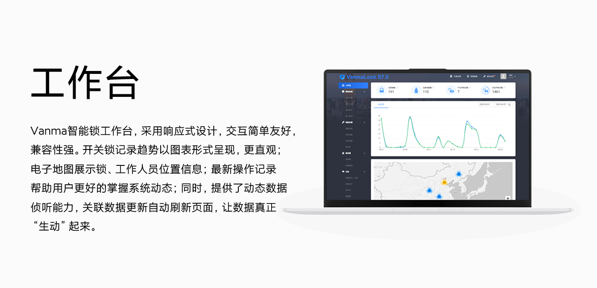 Vanma智能鎖工作臺,采用響應(yīng)式設(shè)計(jì),交互簡單友好,兼容性強(qiáng)。開關(guān)鎖記錄趨勢以圖表形式呈現(xiàn),更直觀;電子地圖展示鎖、工作人員位置信息;最新操作記錄幫助用戶更好的掌握系統(tǒng)動態(tài);同時,提供了動態(tài)數(shù)據(jù)偵聽能力,關(guān)聯(lián)數(shù)據(jù)更新自動刷新頁面,讓數(shù)據(jù)真正”生動“起來。