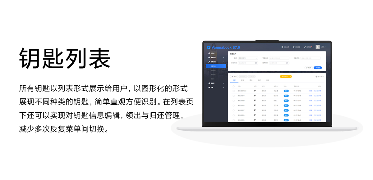 所有鑰匙以列表形式展現(xiàn)給用戶,以圖形化的形式展現(xiàn)不同種類的鑰匙,簡單直觀方便識別。在列表頁下還可以實(shí)現(xiàn)對鑰匙信息編輯,領(lǐng)出與歸還管理,減少多次反復(fù)菜單間切換。