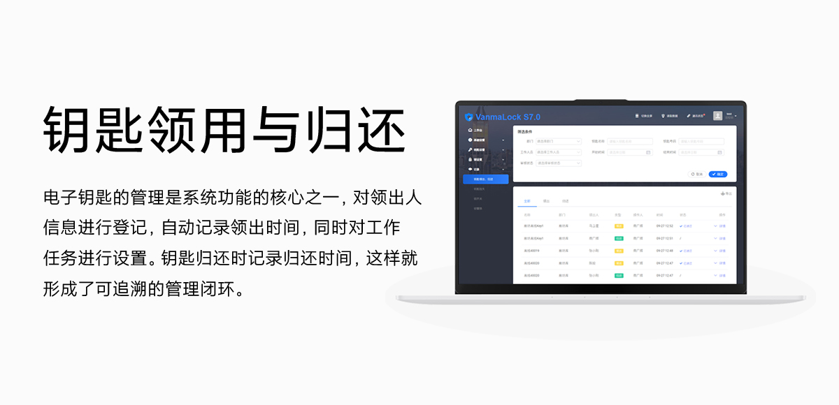 電子鑰匙的管理是系統(tǒng)功能的核心之一,對領(lǐng)出人信息進(jìn)行登記,自動記錄領(lǐng)出時間,同時對工作任務(wù)進(jìn)行設(shè)置 。鑰匙歸還時記錄歸還時間,這樣就形成了可追溯的管理閉環(huán)。