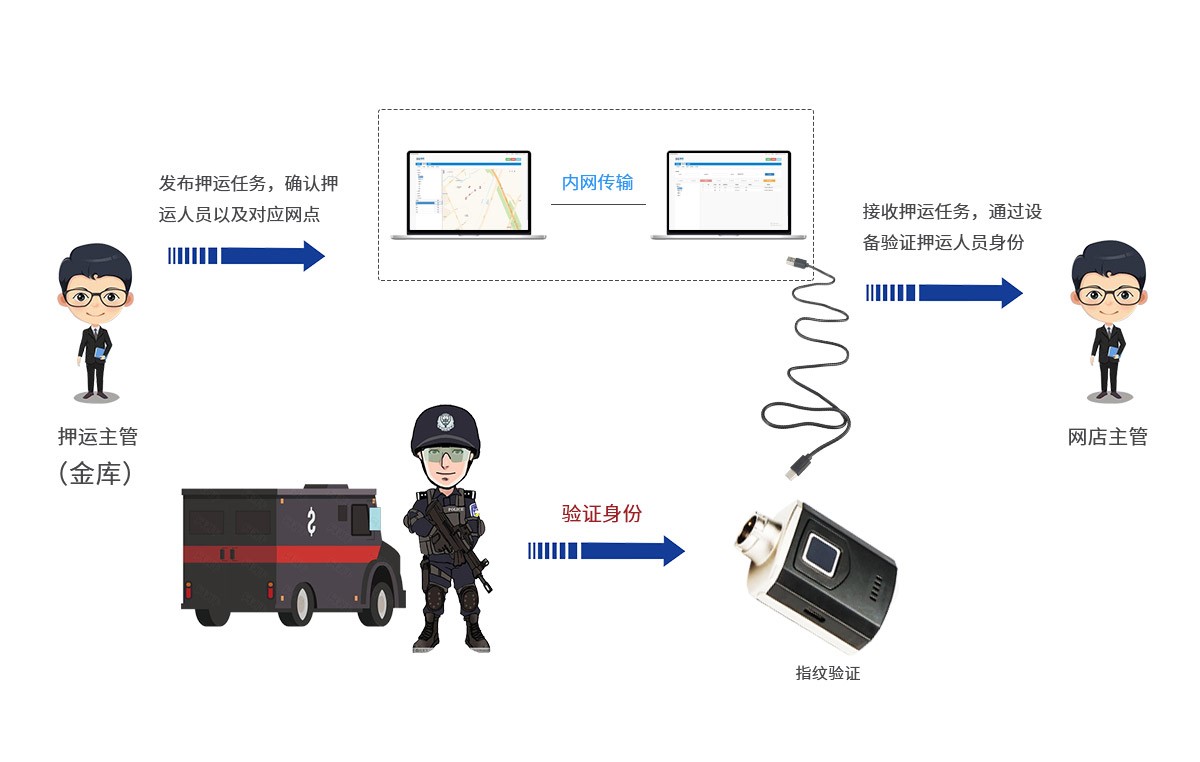 由押運公司主管(金庫主管)制定任務(wù),指定相應(yīng)押運人員以及對應(yīng)網(wǎng)點編號。押運人員到網(wǎng)點后,由該網(wǎng)點主管登錄系統(tǒng)接收任務(wù),并由相應(yīng)押運人員進行身份驗證(在指紋電子鑰匙上),只有(指紋)驗證通過后,方可進行款箱交接。