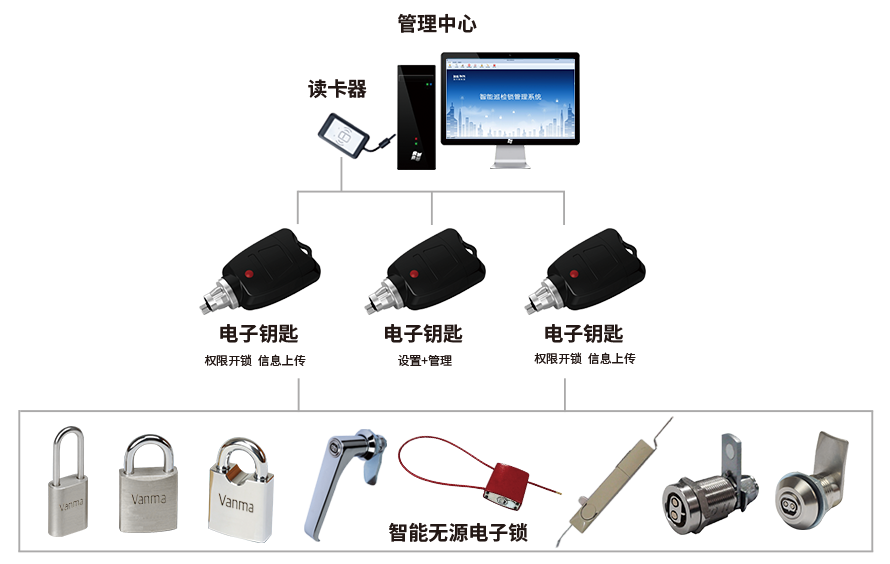 無源電子鎖,顧名思義,是無需外接電源、無需內置電池、無需安裝布線,鎖芯采用封閉技術,用戶通過電子鑰匙和智能鎖控管理軟件實現對鎖具的全方位管理。由電子鑰匙提供電源和識別身份信息;由智能鎖控管理軟件設置開鎖權限、上傳開鎖記錄;智能鎖控管理系統實現權限設置、門鎖狀態查看、開鎖記錄存儲與調閱及鎖具信息管理功能。鎖具操作狀態實時推送到用戶手機或智能鎖控管理系統上,用戶還可根據需求進行其他自定義設置。是目前國際上認可的安防等級最高的解決方案。