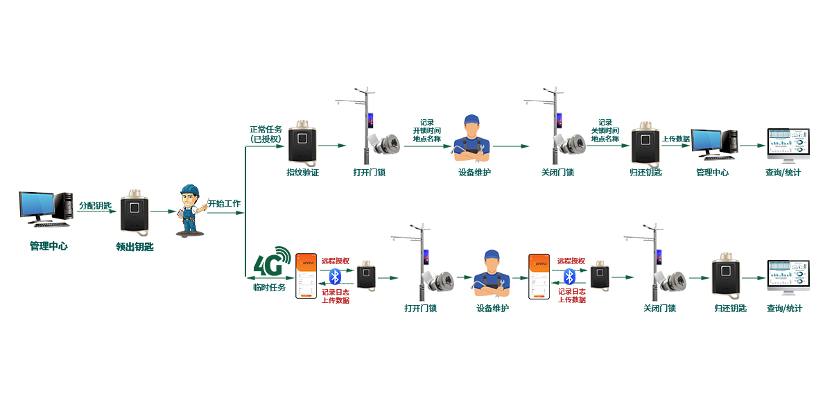 系統(tǒng)應用:工作人員在開鎖前需要通過指紋驗證,通過后才可以打開指定路燈箱的鎖。智能鑰匙會自動記錄開鎖和關鎖的時間。指紋驗證人,鎖具綁定路燈編號,鑰匙有權限,有記錄。這樣工作結束后,將智能鑰匙中的數(shù)據(jù)上傳到管理中心。管理軟件對數(shù)據(jù)進行自動分析,管理者可以通過手機或電腦對相關人員的開關鎖數(shù)據(jù)進行查詢統(tǒng)計分析。結合數(shù)據(jù)分析出來的相關問題,再對管理工作進行改進。